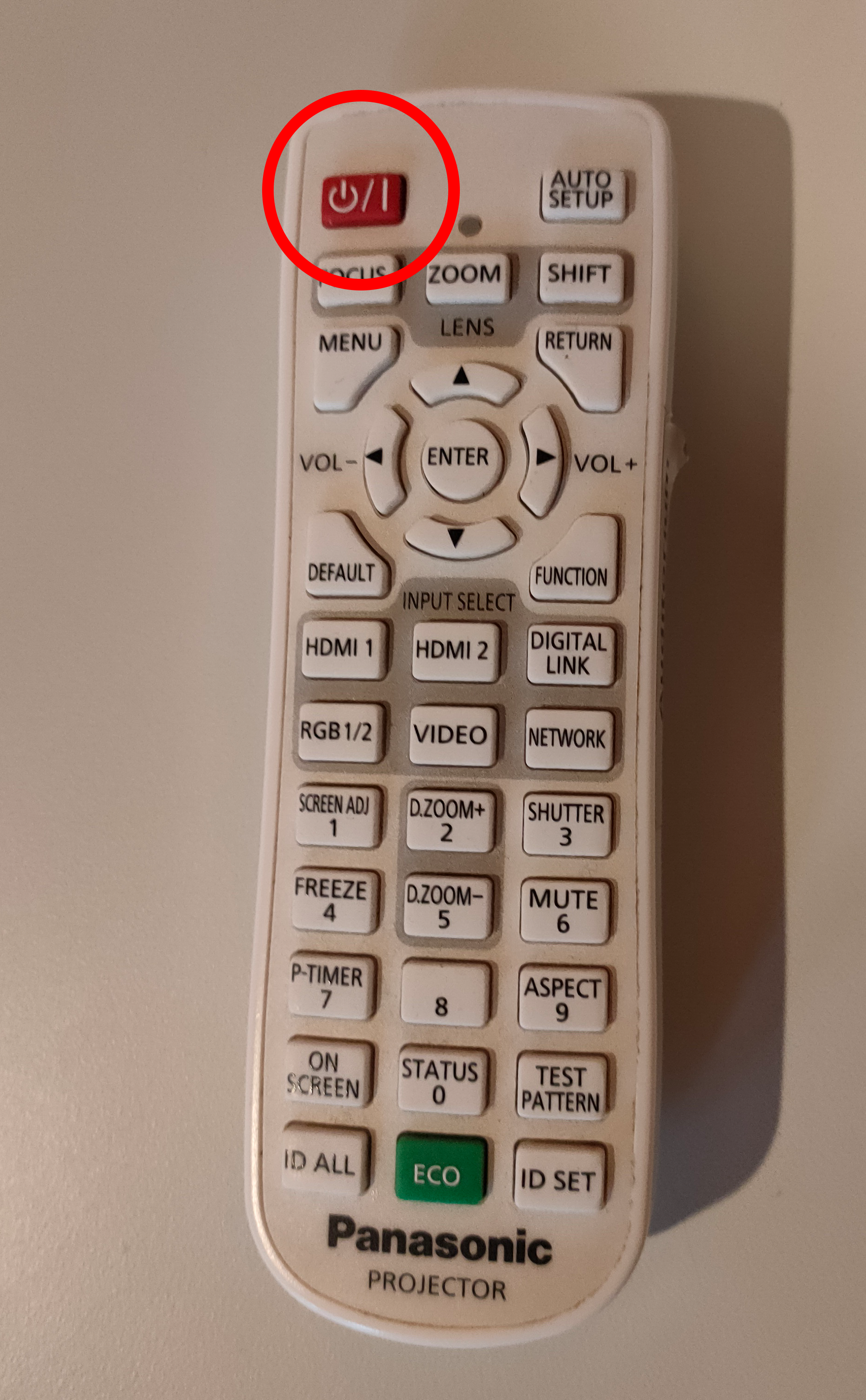 Um den Beamer anzuschalten drücken sie den roten Knopf auf der vor Ort vorhandenen Fernbedienung.