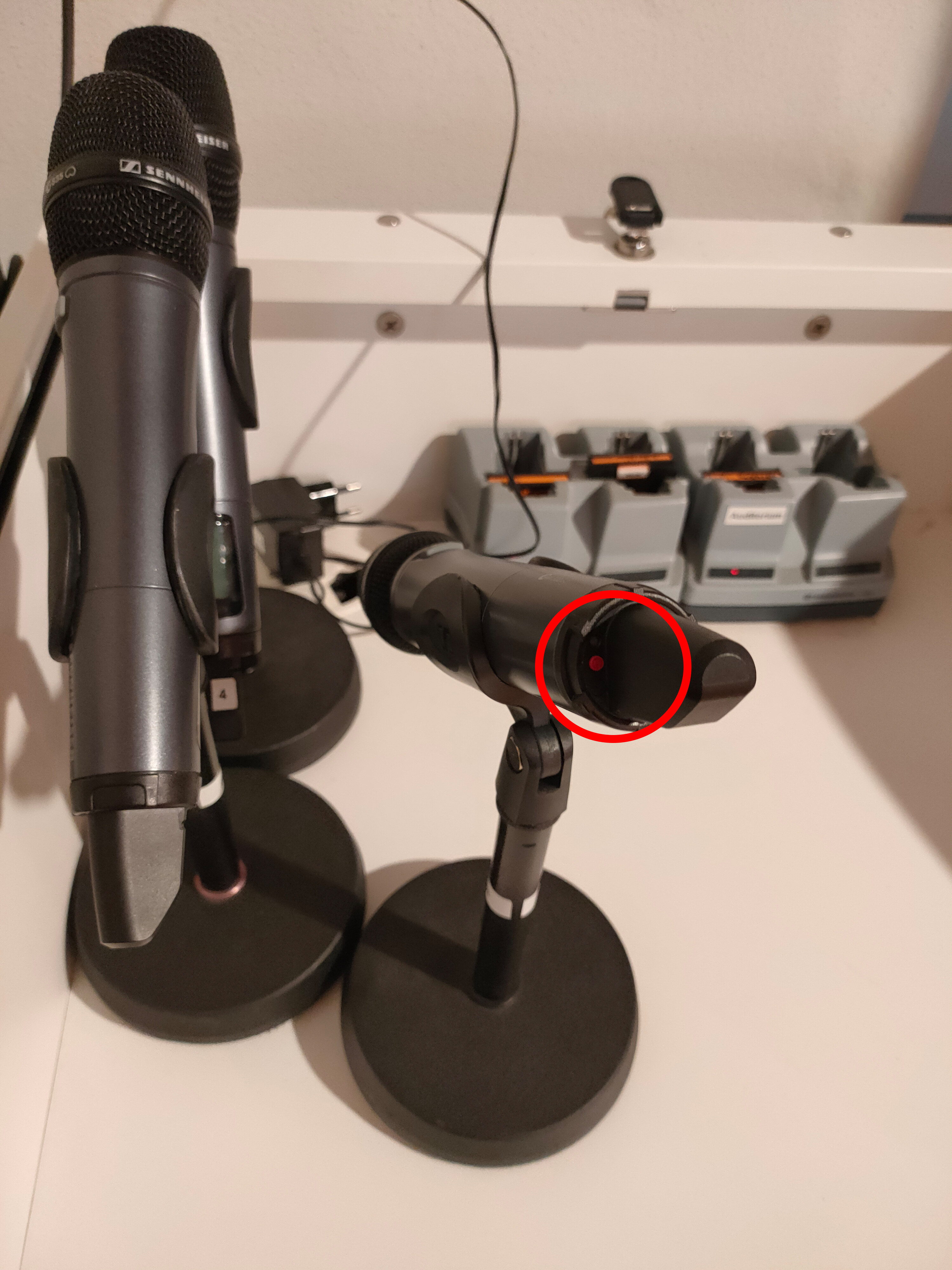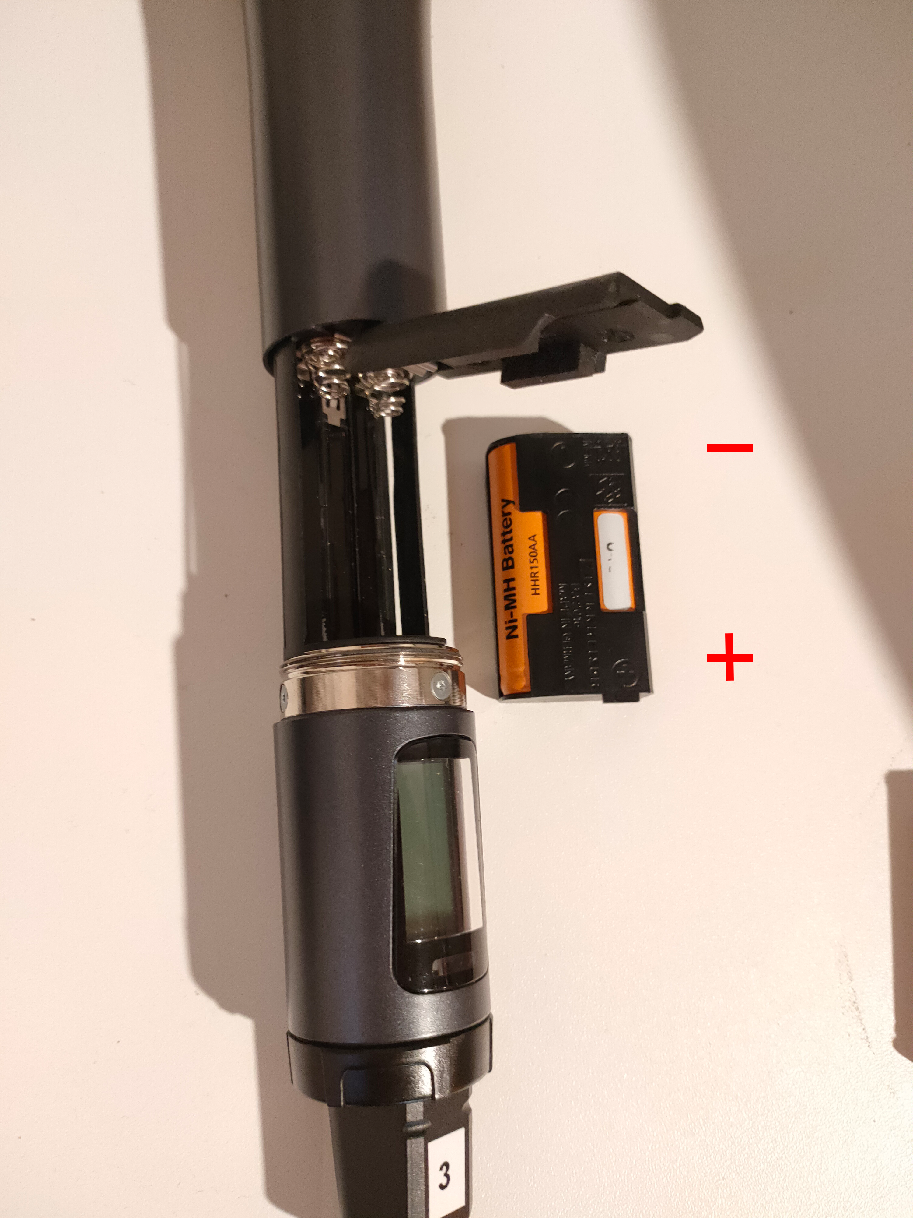 Sollte das Mikrofon anzeigen, dass dessen Akku leer ist, können sie dieses aufschrauben und soweit auseinander ziehen bis das Akkufach sichtbar wird (siehe Bild).