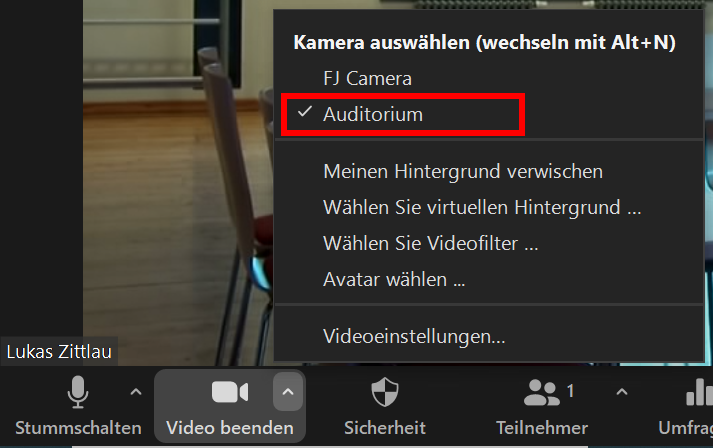 Ob die richtige Kamera ausgewählt ist sehen Sie, sobald Sie Ihr Video auf dem Kamerasymbol unten links einschalten.