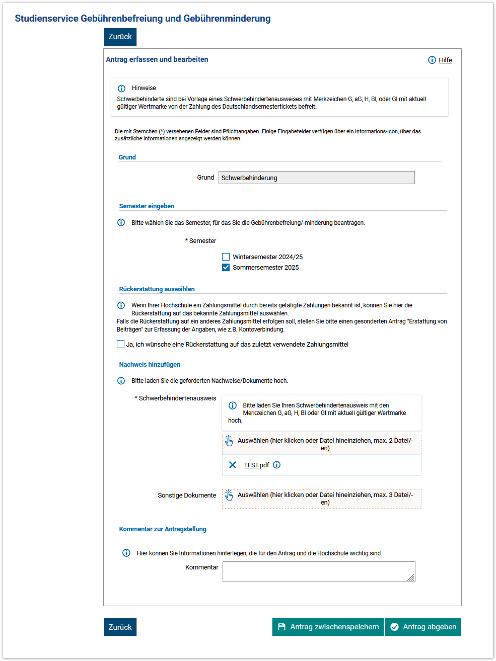 Geben Sie den Antrag nach Eingabe aller erforderlichen Informationen ab.